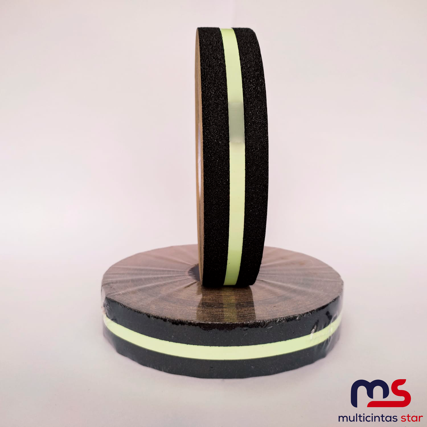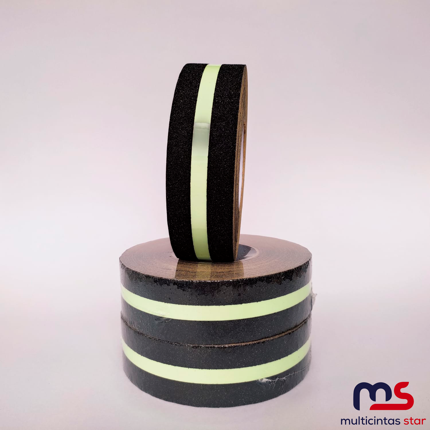 Cinta antideslizante con una película reflectiva verde diseñada para evitar accidentes en entornos industriales y comerciales.